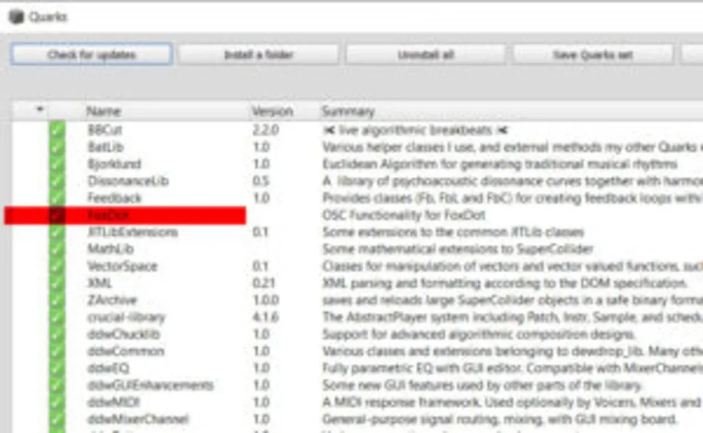 Ok. Vous avez maintenant tout ce qui est nécessaire pour installer et faire fonctionner foxDot. Commencer par ouvrir le logiciel Supercollider. Une fois ouvert, allez dans le menu langage > quarks. Une fenêtre va s’ouvrir, et cherchez là dedans l’extension “FoxDot” et appuyez sur install.