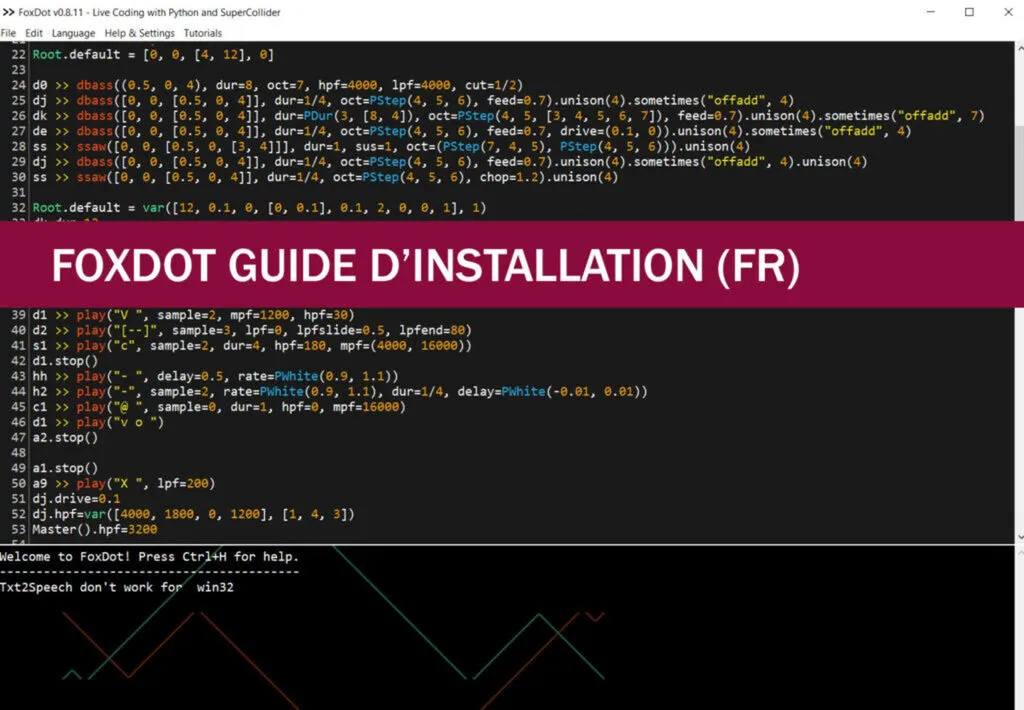 Voici un guide d’installation pour commencer à live coder avec FoxDot. Il vous faudra trois éléments avant de pouvoir utiliser FoxDot.